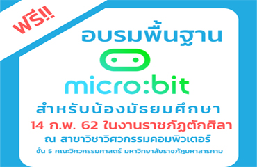 อบรมพื้นฐาน micro:bit อบรมพื้นฐาน micro:bit (ฟรี) สำหรับนักเรียนระดับชั้นมัธยมศึกษา ในงานราชภัฏตักศิลา ณ อาคาร 37 ชั้น 5 สาขาวิชาวิศวกรรมคอมพิวเตอร์ 14 กุมภาพันธ์ พ.ศ. 2562
